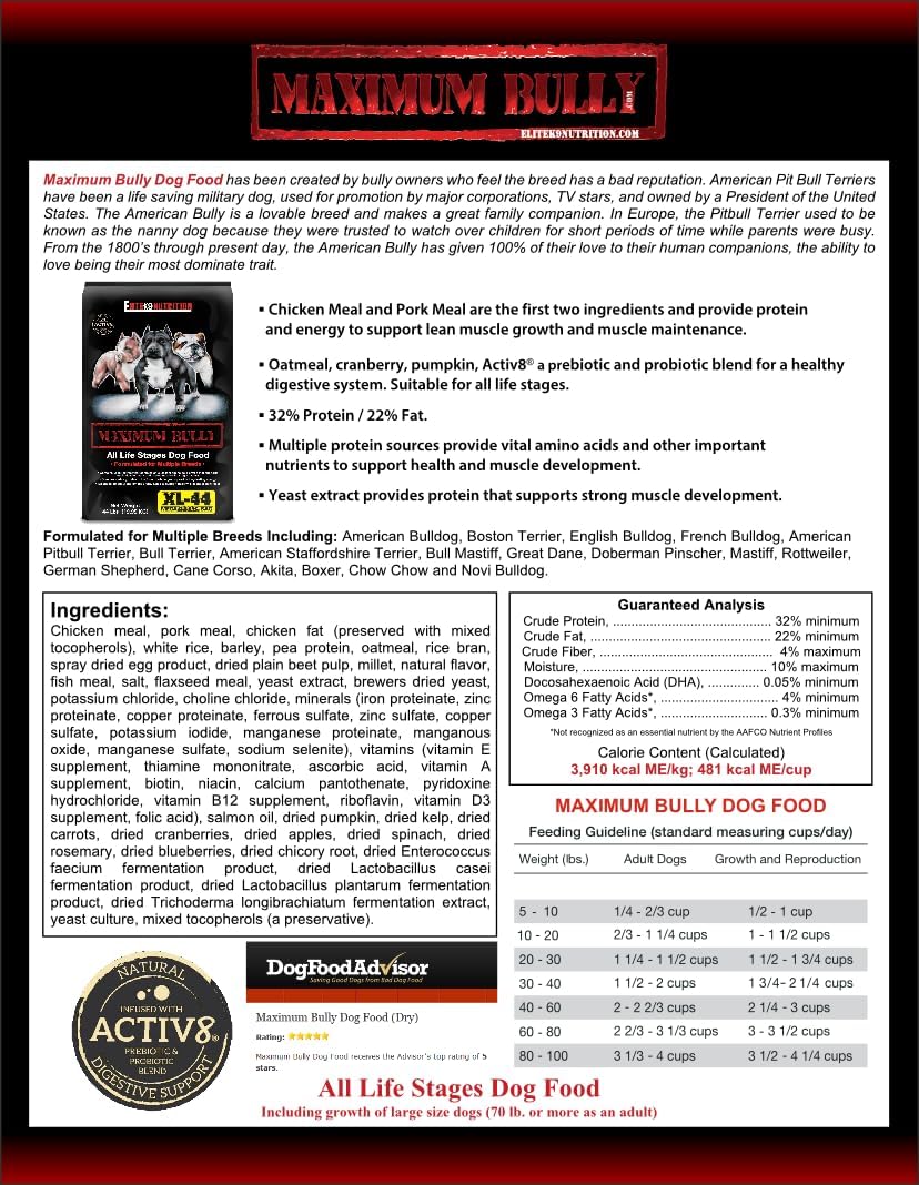 Maximum Bully – All Life Stage Performance Dog Food. High Protein 32% – High Fat 22%. 30lb Bag.
